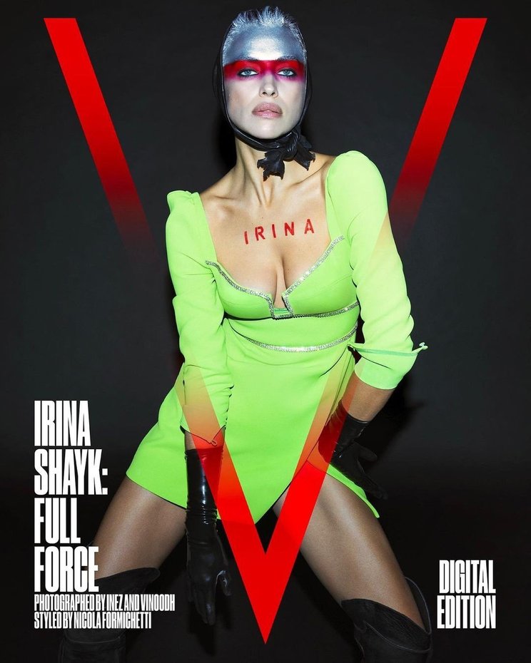 В этом году 36-летняя Ирина Шейк отмечает 15-летие модельной карьеры. И по этому случаю она снялась для двух диджитал-обложек V Magazine. На каждой она предстала в платьях Self-Portrait, перчатках Vex Latex, очень необычным макияжем и надписью «Irina» на груди.