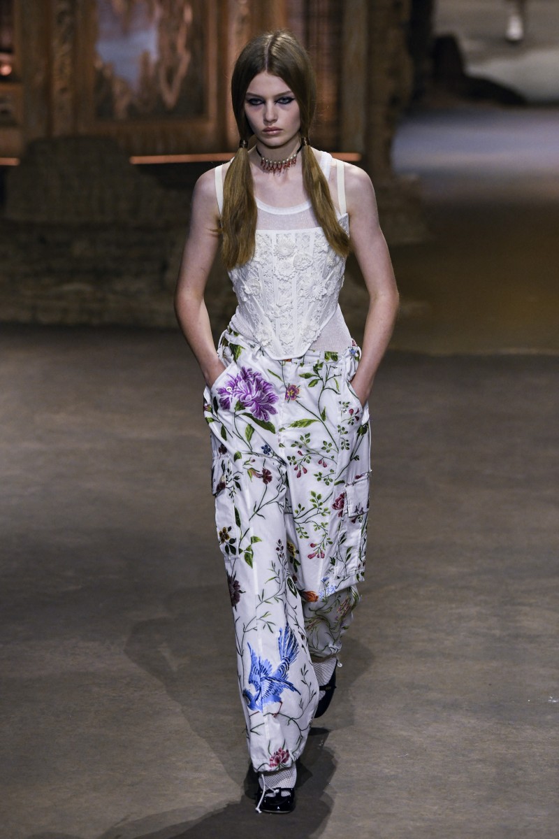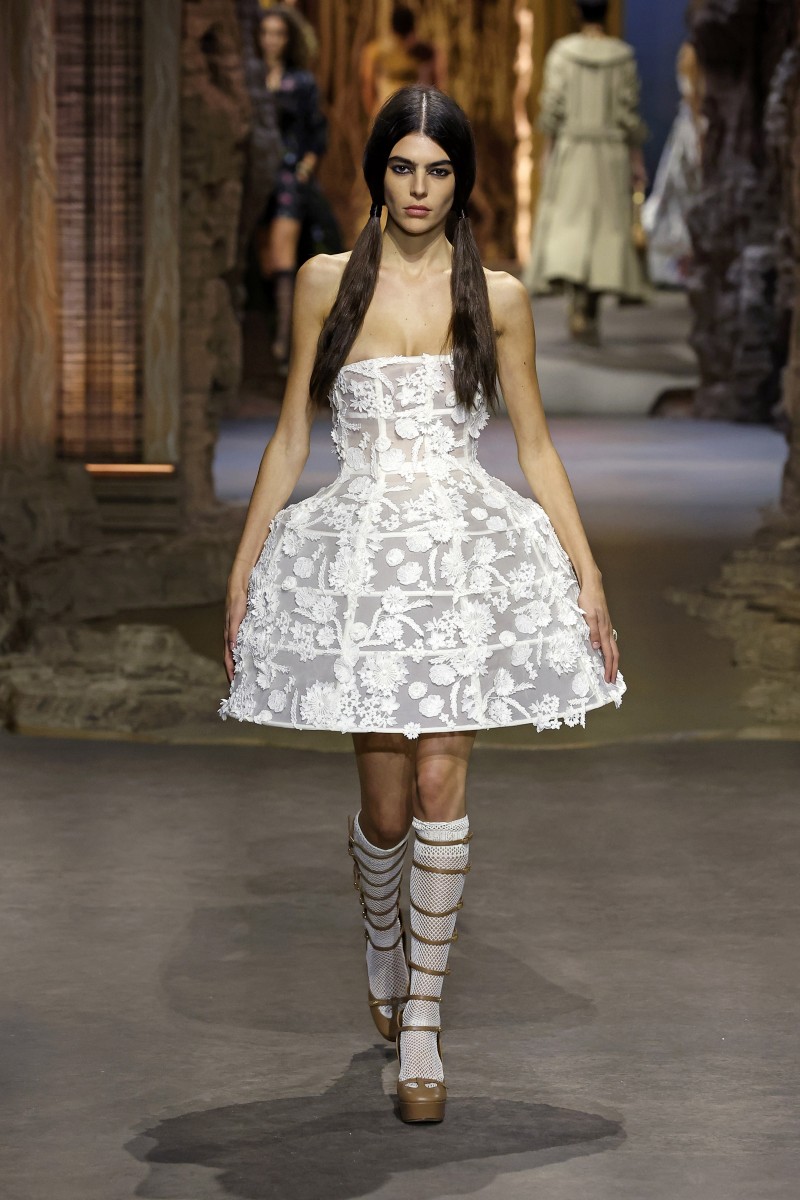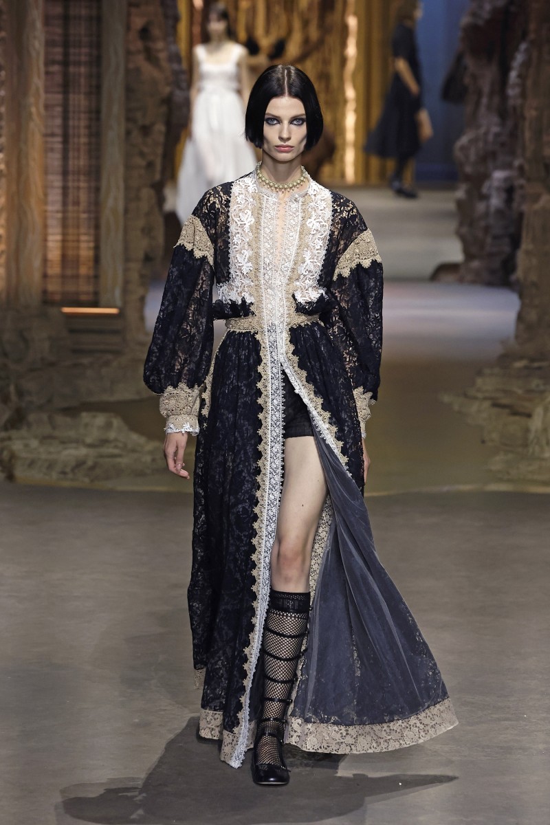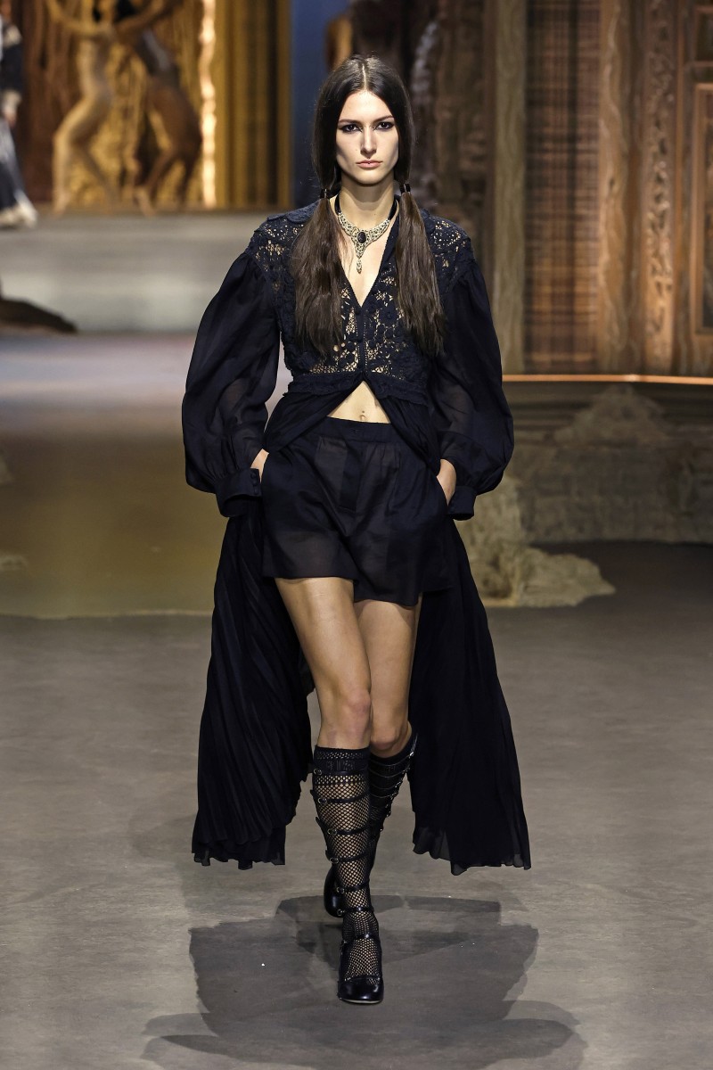 «Идея заключалась в том, чтобы поиграть с отсылкой того времени и понять, как власть и мода находились в диалоге друг с другом», — отметила Мария Грация Кьюри. И у нее это, кажется, действительно получилось. Модели выходили на подиум в одежде с символами придворного стиля, такими как корсеты, кринолины, кружево и объем. При этом главными цветами коллекции стали черный и идеально белый, иногда разбавленные бежевыми оттенками и цветочными принтами.